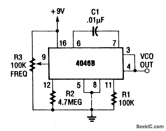 This VCO is adjustable from 60 Hz to 1.4 kHz. C1 can be changed for other ranges