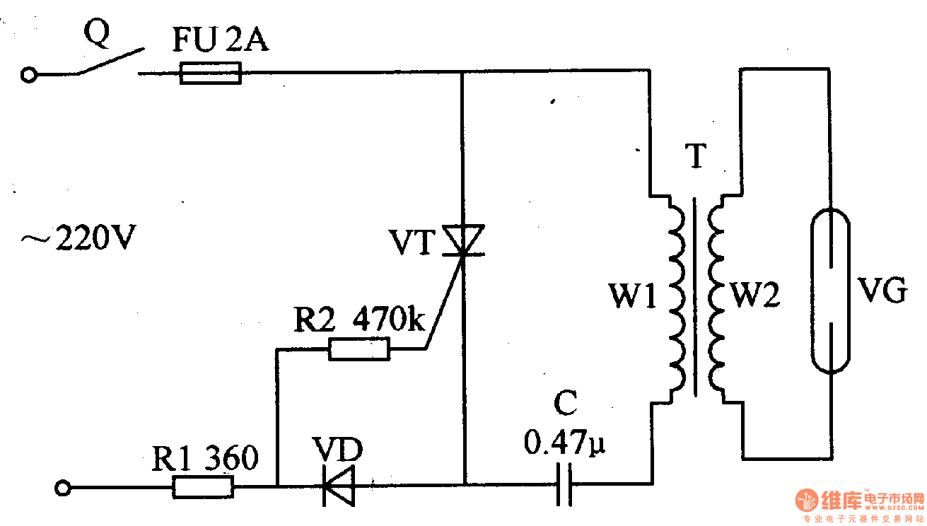 When we turn on the timer Q the 220V AC voltage is limited and bucked by R1 and separate into two parts. One is supplied to VT's gate through R2 while the other one is supplied between VT's anode and cathode and makes VT conducted in AC's positive half cycle and stopped in AC's negative half cycle. With the intermittent work of VT and C step-up transformer T's winding W2 will produce pulse high voltage. Put this voltage on VG to make it produce ozone.