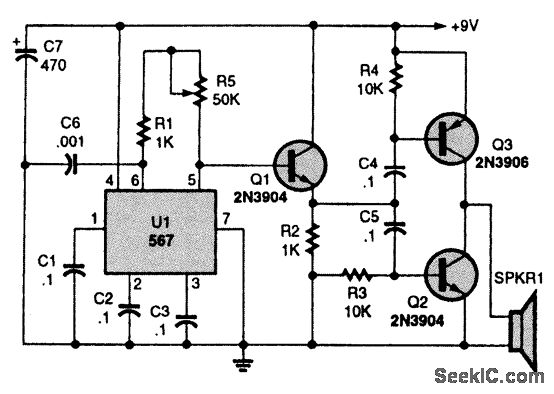 This ultrasonic generator is built around a 567 PLL. By adding a telegraph key, as described in the text, it can be turned into an ultrasonic transmitter.