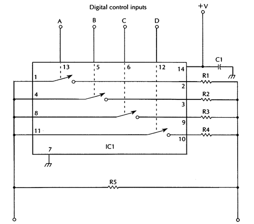 IC1 CD4066 quad bilateral switchC1 0.1-μF capacitorRI 10-kΩ, 1/4-W 5% resistorR2 4.7-kΩ, 1/4-W 5% resistorR3 2.2-kΩ, 1/4-W 5% resistorR4 1-kΩ, 1/4-W 5% resistorR5 1-MΩ, 1/4-W 5% resistor