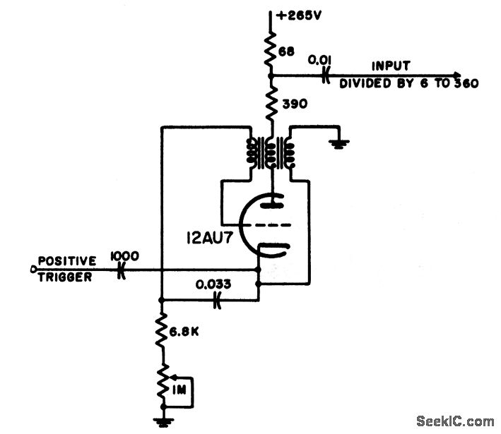 Plate-to-cathode-to-grid coupled blocking oscillator is used to obtain high division ratios for pulses when stability of count is not too important. Lack of fixed bias means that this circuit will free-run in absence of input, but bias can be added if needed.-NBS, Handbook Preferred Circuits Navy Aeronautical Electronic Equipment, Vol. 1, Electron Tube Circuits, 1963, p N7-1.