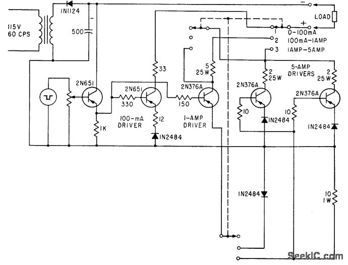 Constant-current drive for pulse-testing of power transistors at maximum power without over heating has three current ranges. A-c signal in phase with collector supply is advanced 88° by phase-shift bridge, to center one-shot mvbr pulse on peak of cc collector supply.-D. H. Breslow, Measuring Parameters by Power Transistor Pulse Techniques, Electronics, 34:1, p 120-122.