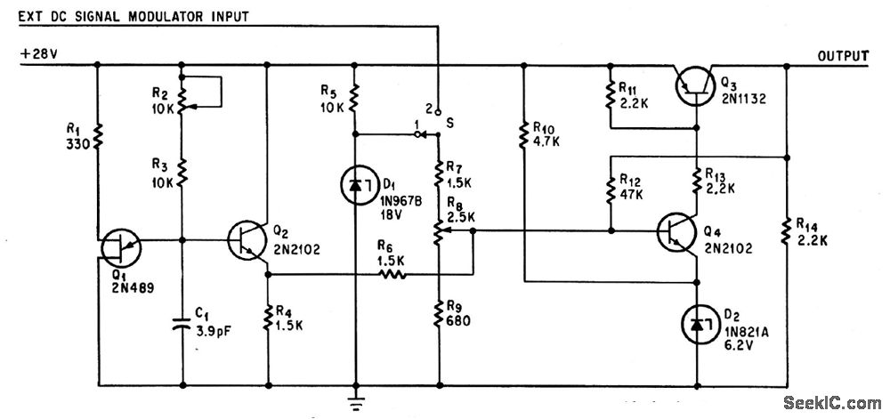 With S1 at 1, circuit is unjunction-transistor pulse generator with prf variable from 13 to 25 kc, and duty cycle variable from 0 to 100%. With S1 at 2, circuit is modulator whose output pulse width varies with level of external d-c signal.-D. L. Patillo, Pulse Generator Circuit Doubles Modulator, Electronics, 38:8, p 91-92.