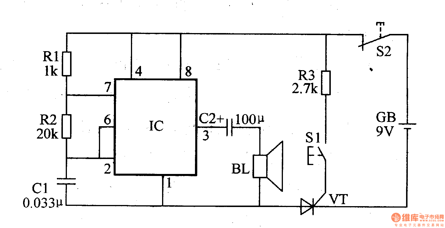 This patient SOS appliance consists of trigger circuit and oscillator. After the patient press S1, +9V voltage put on the gate pole of VT through S2, R3 and S1 to trigger VT on, and the oscillator is on and at work. The oscillator signal at the frequency about 1 KHz is output by pin 3 of IC to drive speaker BL send out a high frequency alarm sound. After the medicine box is open, S1 is off and VT cut off, then oscillator is power off and BL stops.