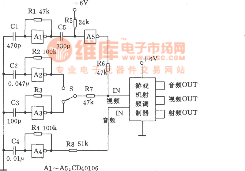 The television signal generator composed of a game RF modulator and a piece of CMOS integrated circuit is shown as the chart. In the Figure: Schmitt triggers Al ~ A4 and RC components form the line sync, horizontal, vertical, and audio signal oscillator. S is used to select the horizontal, vertical signal. A5 and differential circuit C5, R5 will shape the line sync signal in 5 ~ 7μs positive narrow pulse, which will be sent into the RF modulator with horizontal, vertical signal. The power can use the 6V cascading battery.