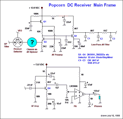 Shown to the right is the schematic to a low cost popcorn direct conversion receiver main frame. To complete the receiver, a front end band pass filter and a VFO with an output power of 7 dBm is required. This is indeed a frugal project using 4 cheap transistors, an RC low pass filter and an LM386N for output power to a pair of low-impedance headphones. The builder also has a choice of 5 diplexers and an optional mute circuit. This receiver is easily built using Ugly Construction and can be built in 3-4 hours with a bit of luck.