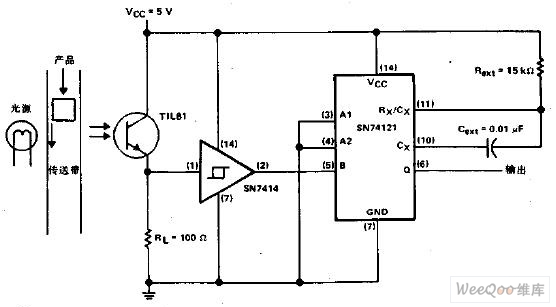 When the object on the band carrier keeps out the light, this circuit will output a pulse. The light source makes the photoelectric transistor to keep in the conduction state. This will produce a high logic level voltage on the Schmitt inverter, and it also produces the low logic level voltage on the pin-5 of the monostable circuit which is compatible with the TTL. When the object keeps out the light, the TIL81 turns off the Schmitt inverter to trigger the monostable circuit.