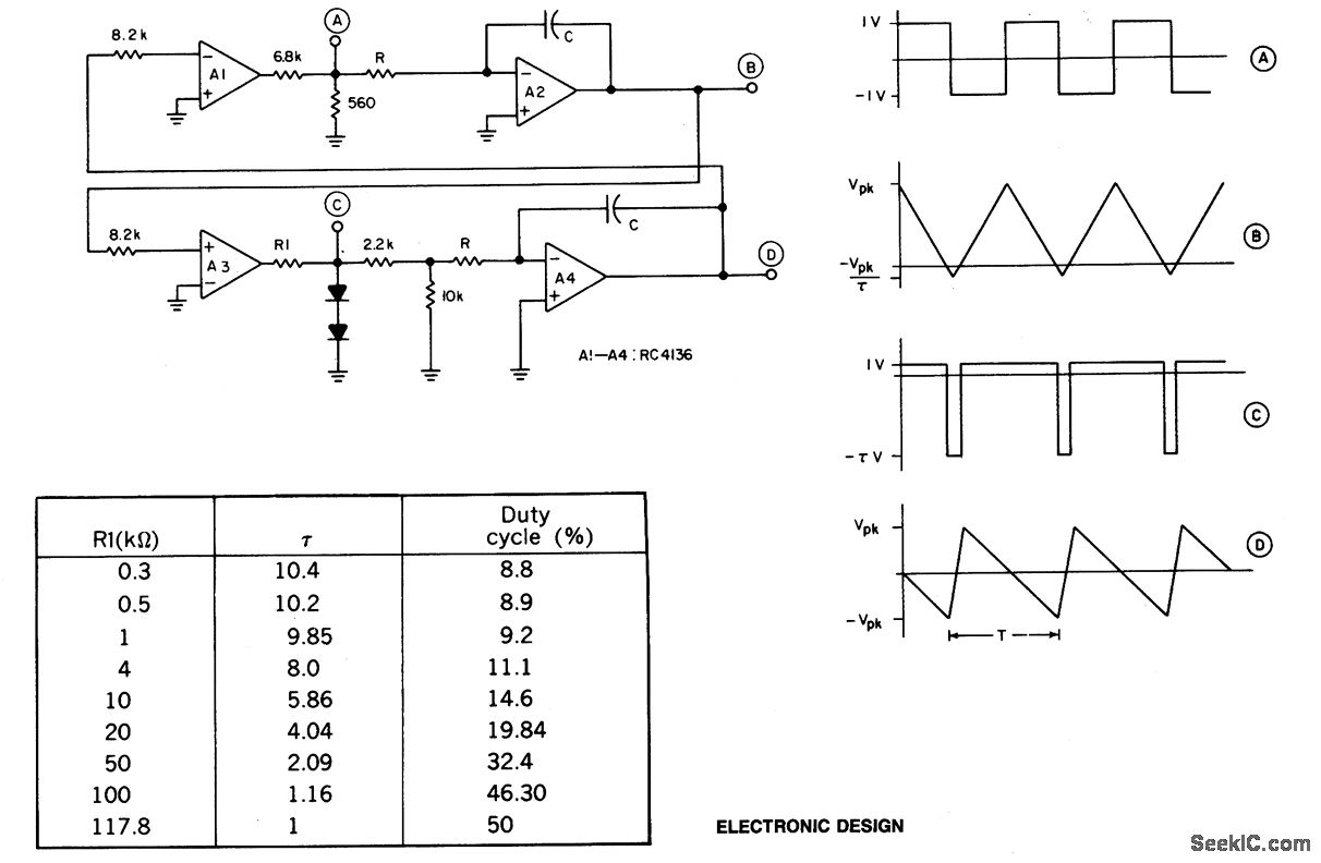 http://www.seekic.com/circuit_diagram/Signal_Processing/QUAD_op_AMP_GENERATES_FOUR_DIFFERENT_SYNCHRONIZED_WAVEFORMS_SIMULTANEOUSLY.html