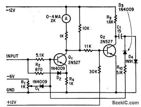 Either positive or negative pulses above predetermined minimum amplitude force Q1 into saturation and turn Q2 off, causing the meter to deflect immediately. Circuit may also be used as pulse stretcher or threshold detector.-C. F. Johnson and J. T. Loiselle, Bipolar Pulse Detector Features Meter Display, Electronics, 38:24, p 63.