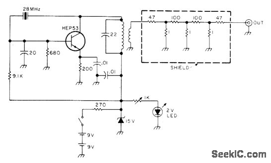 Single-transistor 28-MHz crystal oscillator and carefully designed attenuator network serve to generate signal of about 1μA for checking performance of amateur radio receiver, Can be used on any band down to 6 meters by appropriate choice of crystal and LC circuit components. Coil is CTC LS5 form having 15 turns No. 22 enamel and 2-turn link.-Is It the Band or My Receiver?, 73 Magazine, Oct. 1976, p 132-133.