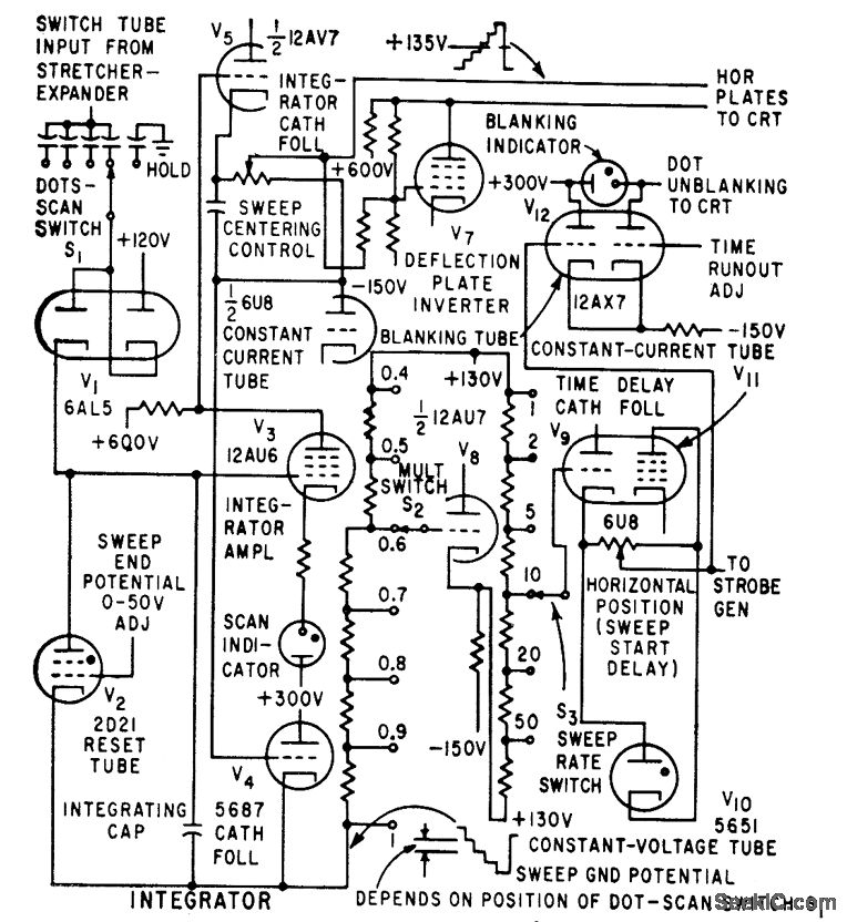 Provides horizontal def action voltage for crt and time advance information for comparator tube in strobe generator. Increase of d-c bias superimposed on staircase advances start of sampling with respect to start of ramp, decreasing op parent lime delay in start of d-c trace. Blanking indicator in staircase generator is on when screen is blanked. Scan indicator lashes when staircase is sweeping. Staircase advances one stop for each displayed sample.-W. E. Bushor, Sample Method Displays Millimicrosecond Pulses, Electronics, 32:31, p 69-71.