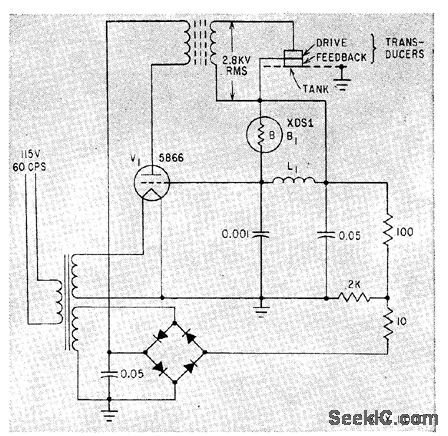 Current from feedback transducer goes through ballast lamp B1, keeping oscillator circuit V1 tuned to desired frequency between 20 and 40 kc.-S. Vogel, Ultrasonic Equipment in Industry, Electronics, 34:4, p 52-55.