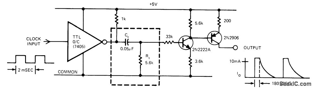 Clock-pulse differentiator/buffer shortens duty cycle of 500-Hz clock signal having positive period of 1000 ps. Open-collector 7405 inverter acts as buffer. Ct and Rt are primary differentiating components.Saturation of transistors provides some stretching of output and gives output pulse width of about 180 μs. Developed for driving regulated power supply having clock-controlled short-circuit protection.-J. L. Bohan, Clocking Scheme Improves Power Supply Short. Circuit Protection, EDN Magazine, Match 5, 1974, p 49-52.