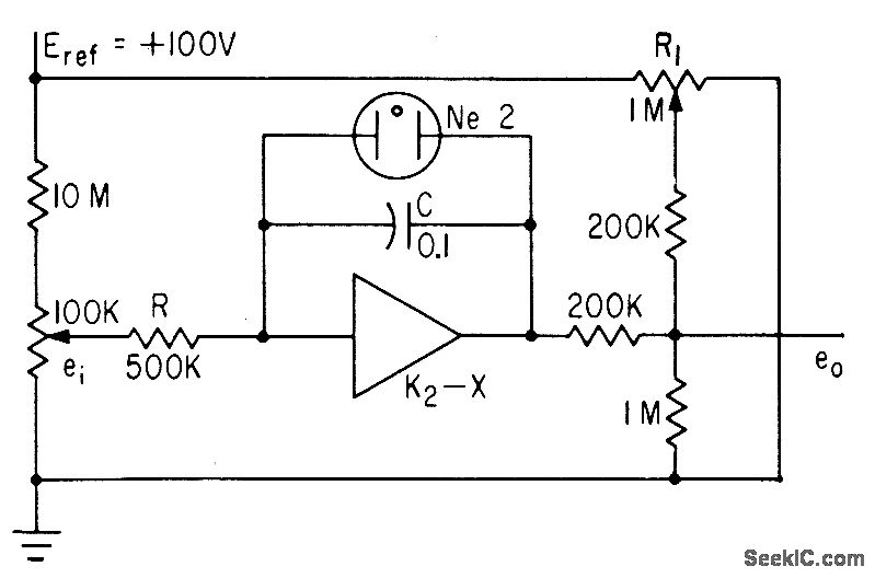 Uses operational amplifier in integrating circuit, neon lamp as automatic switch, and resistance network that allows output to be varied around level set by R1. Used to generate sweeps with high linearity up to 18 cps.-A. Angelone, Subaudio Sawtooth Generator Gives One-Percent linearity, Electronics, 34:48, p 42-43.