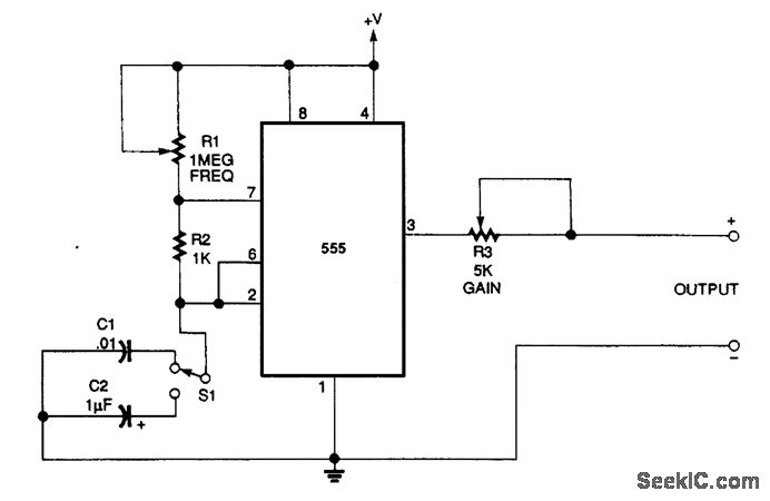 An NE555 generates signals for test purposes. Frequency range is from 20Hz to 10kHz, depending on the setting of S1. +Vis 5 V.