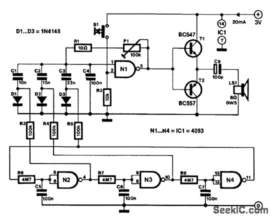 This melody generator, based on a 4093 CM0S Schmitt trigger, can be used in alarms, doorbells, and cars (audible reverse gear or lights-on indicator).Three of the four NAND gates in the 4093 are connected in series by RC networks. Oscillation is affected by feedback of the output signal of N4 to the input of N2. The logic-high levels produced by the cascaded gates in the oscillator circuit are used to bias one of associated diodes D1, D2, or D3). The relevant diode connects one of the frequency-determining capacitors (C1 through C3) to tone oscillator N1. The audio signal available when S1 is pressed is applied to complementary transistor pair (T1/T2) that drives the loudspeaker. The frequency of the emitted tone can be adjusted to individual taste with preset P1.