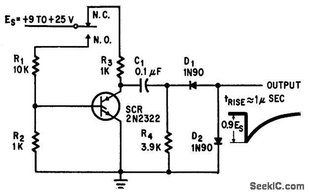 Push button fires scr to produce single pulse with rise time of 1 micro. sec.-R. W. Bailey, Push Button SCR Equals Fast Pulse, Electronics, 37:30, p 41-42.