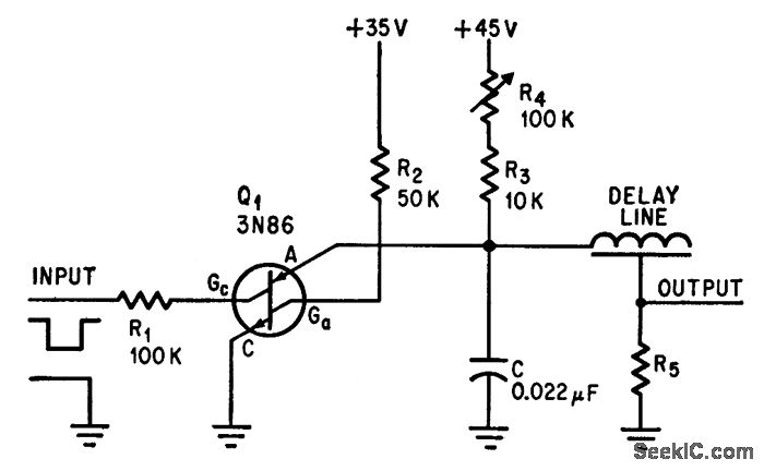 R4 varies relaxation frequency of pnpn silicon controlled switch from 1 to 500 pps, independently of pulse duration and amplitude. For operation in gated mode, cathode gate pulse at input should be -1.5. v at 50 microamp.-H. H. Wieder, Silicon Controlled Switch Con Generate Pulses, Electronics, 38:2, p 79.