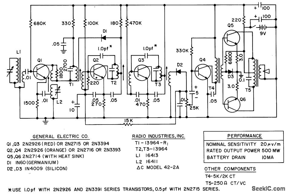 Nominal sensitivity is 20 microvolts per meter, rated power output 500 mw, and battery drain 10 ma.- Transistor Manual, Seventh Edition, General Electric Co., 1964, p 295.