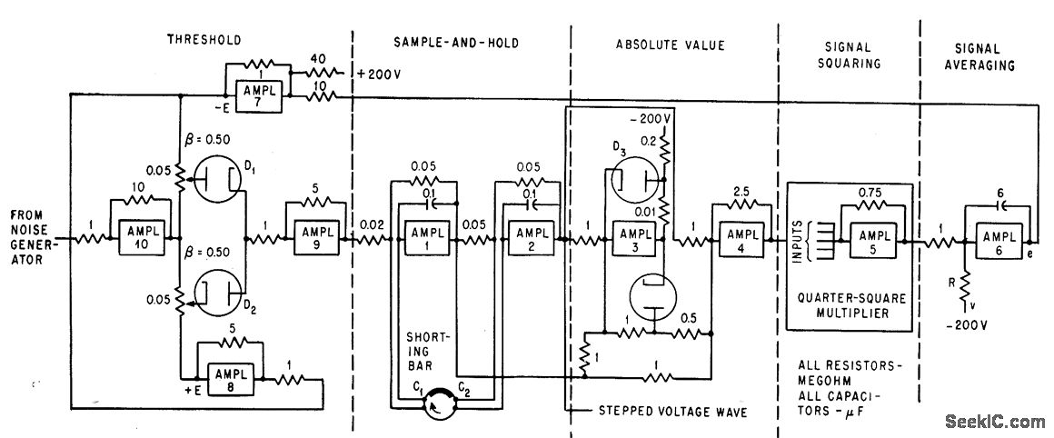 Operational amplifiers of analog computer produce periodically slopped waves by clipping and sampling raw noise signal. Feedback maintains desired power density spectrum.-N. D. Diamantides and C. E. McCray, Generating Random Forcing Functions for Control-Systems Simulation, Electronics, 34:33, p 60-63.