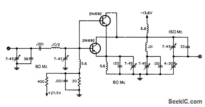 Input is tuned to 80 Mc and output to 160 Mc. Parallel tuned circuit with built-in trap is required in output circuit to suppress 80-Mc fundamental. Conversion power gain is 6 db. Maximum power is 650 mw.-W. A. Rheinfelder, Choosing the Best Transmitter Output Stage, EEE, 11:10, p 48-53.