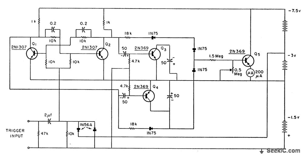 Provides meter indication of frequencies from 0.2 to 10 cps. Responds rapidly to changes in input frequency. Input signal is conyerted to square wave by limiting and differentiating network and bistable flip-lop, with period of square wave indicated on meter calibrated in pulses per minute. By alternately charging each one of pair of capacitors, steady voltage is maintained on capacitor connected to meter while other is charging.-Fast Acting Subaudio Frequency Meter, Electronic Circuit Design Handbook, Mactier Pub. Corp., N.Y., 1965, p 150.