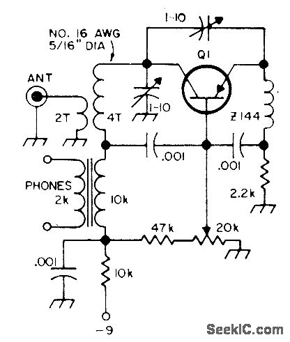 Simple single-transistor superregenerative receiver is adequate for copying many local signals in 2-meter amateur band. With components shown, tuning range is about 90 to 150 MHz. Transistor can be GE-9 or HEP-2.-Circuits, 73 Magazine, Feb. 1974, p 100.