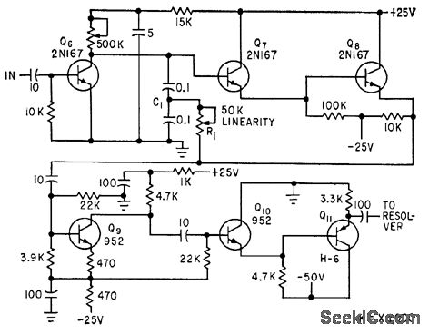 Accepts pulse from monostable mvbr and generates signal for sweep resolver of ppi radar. Voltage rises at constant rate during mono off time, and is held at zero during on time. Cascaded emitter-follower Q7-Q8 provides impedance match to output. Q9-Q10-Q11 provide required power for sweep resolver while preventing thermal runaway at normal temperatures.-C. E. Veazie, Transistorized Radar Sweeps Circuits Using Low Power, Electronics, 32:26, p 46-47.
