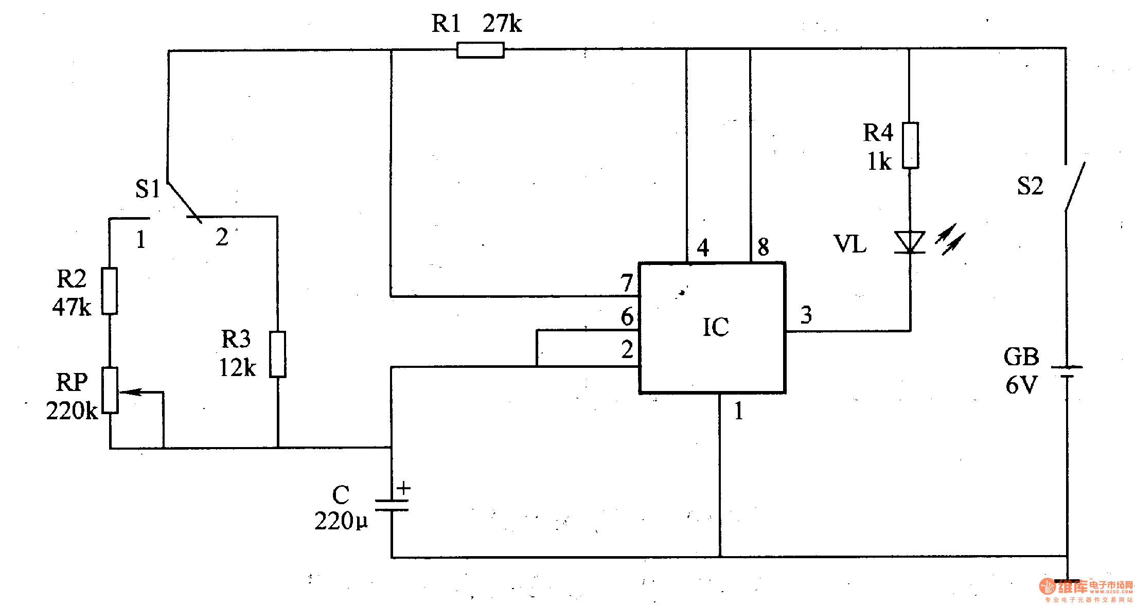 The circuit consists of shining diode V, resistor R1-R4, potentiometer RP, capacitor C, switch S1, S2 and battery GB (I t is showed in picture 9-58.).