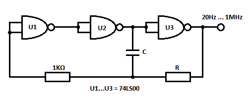 This is a very simple square wave generator circuit built with IC 74LS00 that can generate square signals with frequencies between 20 Hz and 1 MHz. Its stability is good enough for most applications. The output freq. is dimensioned through the RC components and time delay of the 3 inverter gates. The time delay of a logic gate is the elapsed time between a change of input state and the resulting change of the output state.To prevent the temperature and voltage supply from affecting the frequency of the square wave generator, the oscillator freq. fo must be smaller than 1/2tpn where:
