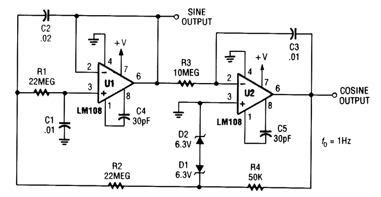 This circuit produces a 1-Hz sine wave using two op amps. A single-chip dual op amp could be used as well.