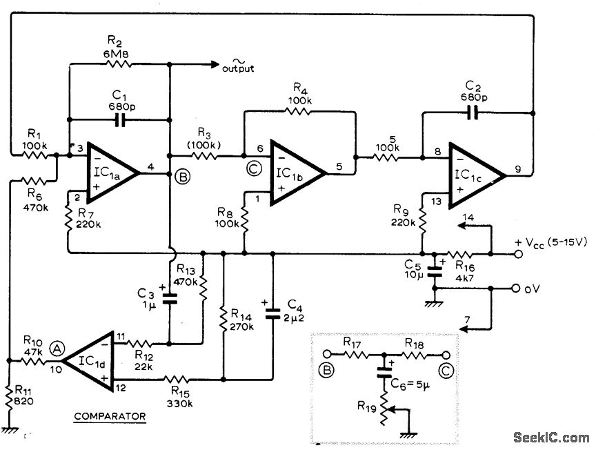 Uses low-cost LM3900N quad differential amplifier IC in lowdistortion oscillator for which third harmonic distortion is typically 0.5%. Peak-to-peak amplitude of sine-wave output is typically 25% of source voltage VCC. Frequency can be changed by altering single component. R3. or by inserting between points B and C an RC network and pot connected as shown in inset. Article gives design equations for frequency and Q.-T. J. Rossiter. Sine Oscillator Uses C.D.A. Wireless World. April 1975. p 176.