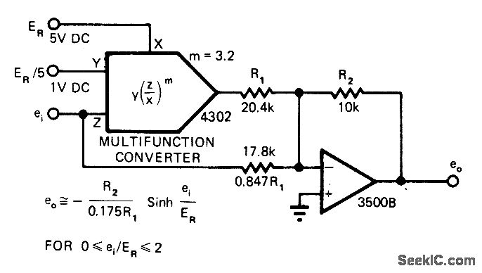 Burr-Brown 4302 multifunction converter and opamp generate hyperbolic sine transfer function with response matching ideal curve within 0.7%. Technique permits setting powers and roots at fractional as well as integer values. Converter shown is set for exponent of 3.2. Choice of amplifier gain and ref erence voltage scales response for given input and output signal levels. Article gives design equations.-J. Graeme, Sinh Generator Boasts 0.7% Error, END Magazine, Aug. 5, 1978, p 70 and 72.