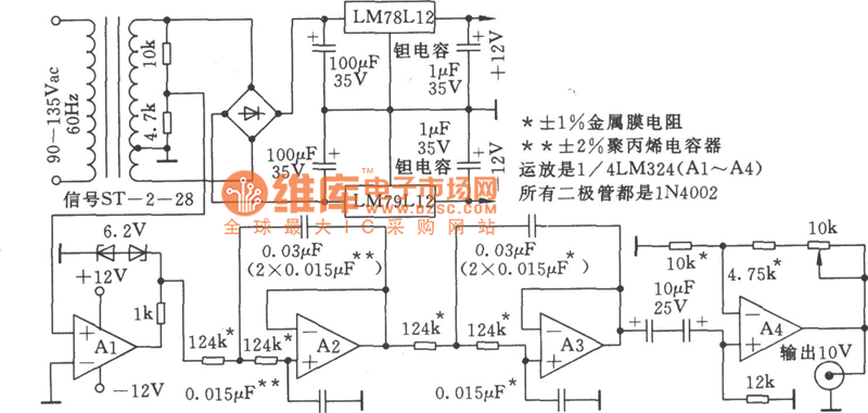 As shown in the figure, it is the sine wave signal source with stable output. Firstly, using the primary operational amplifier comparator, and it produces a 60Hz constant amplitude square wave. The comparator's output terminal has a pair of 6.2V zener diodes which is connected back-to-back . The next is the two-stage Sallen-key type low pass filter, it can filter all the harmonic. The capacitance coupling amplifier separates the DC component which is produced by the unequal zener voltage in the limiter circuit, then it can compensate the filter's loss, and it accurately calibrates the output amplitude to 10V peak value.