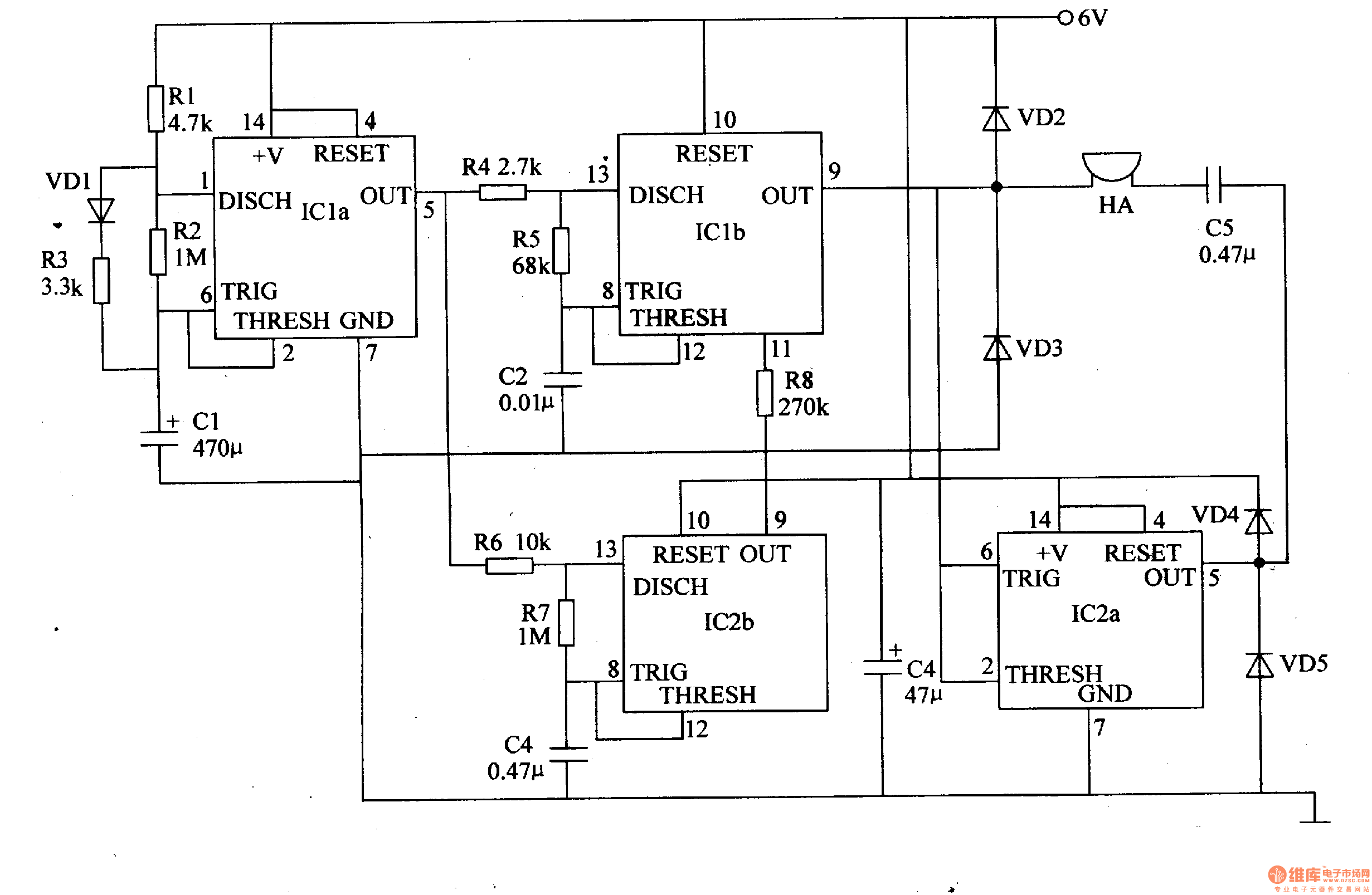 The audio output circuit consists of IC2a, diode VD2-VD5, capacitor C5 and buzzer HA.