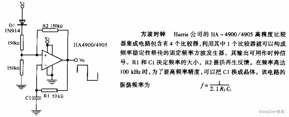 Square wave clock: The HA-4900/4905 high precision comparator integrated circuit which is produced by the Harris company has four comparators, you can form the fixed frequency square wave generator with good frequency stability by using only one comparator, the output can be used as the clock signal. The frequency is decided by the R1 and C1, R2 supplies the regeneration feedback. When the frequency is 100kHz, in order to improve the frequency precision, we can change C1 into the crystal. The oscillation frequency of this circuit f=1/2.1R1C1.