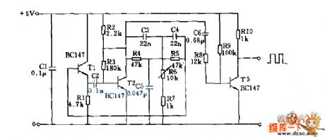 T1 and T2 in the circuitform theinherent oscillator, T3 is output level. Network consists of high-pass filter (C3, C4, R6 + - R7) and low pass filter, it's output is added to the T3 base via C6 and R8, and in the collector of T3, it willget required square wave oscillation signal.