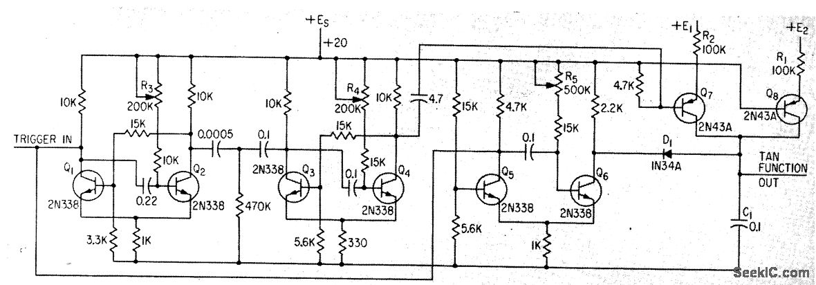 Generates approximation of tangent function for slant-range correction of video signal fromairborne infrared scanner. Ramp mvbr Q5-Q6 and timing mvbr Q1-Q2 are triggered simultaneously.-J. L. Woika, Generating Tangential Sweeps for Infrared Mapping, Electronics, 34:41, p 64-66.