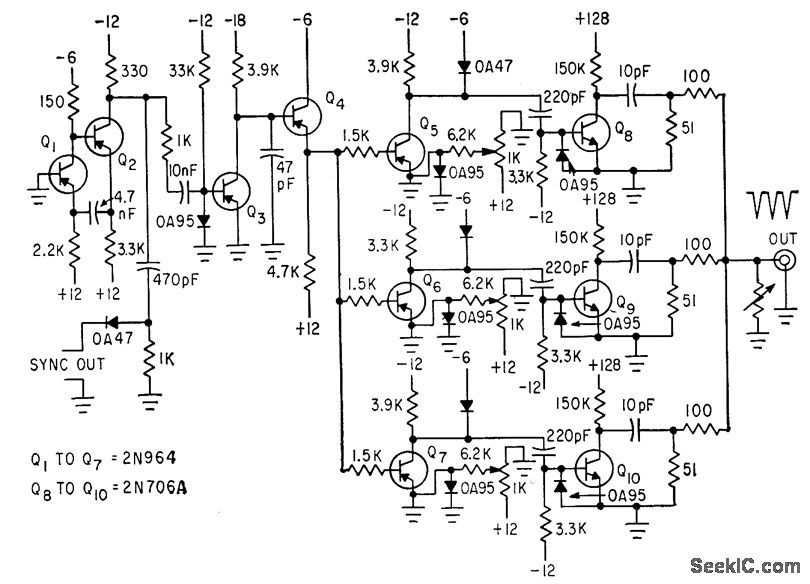 Free-running mvbr Q1-Q2 triggers sawtooth generator Q3, which in turn acts through emitter-follower Q4 to drive delay-adjusting amplifiers Q5, Q6 and Q7, each driving silicon tratnsistor working in avalanche mode. Common output is group of three 10-v pulses having rise times below 1 nsec.-R. Charbonnier, Avalanche Transistors Test 10.Nsec Logic, Electronics, 36:28, p 46.