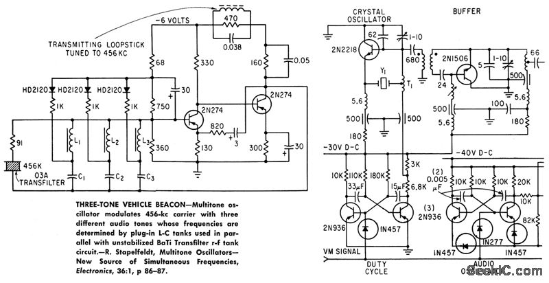 Multitone oscillator modulates 456-kc carrier with three different audio tones whose frequencies are determined by plug-in L-C tanks used in parallel with unstabilized BaTi Transfilter r-f lank circuit.-R. Stapelfeldt, Multitone Oscillcators-New Source of Simultaneous Frequencies, Electronics, 36:1, p 86-87.