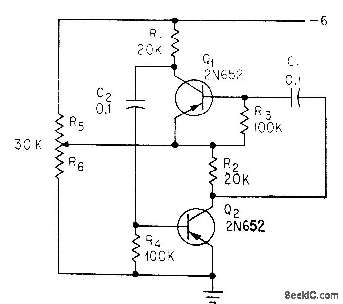 Output waveform can be rectangular or sawtooth, with polarity depending on setting of potentiometer. -C. Sing, Advantages of Free-Running Cascade Multivibrators, Electronics, 37:5, p 28-29.