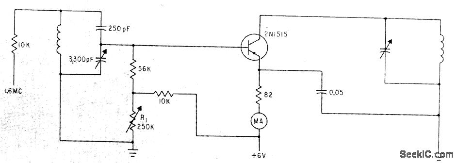Measures power gain, with emitter current varied manually by R1 in base circuit. Used to determine conditions for uniform emitter current, required for uniform gain in transistor circuits despite variations in d-c beta values of transistors.-K. Redmond, Biasing Transistors for Uniform Gain, Electronics, 33:50, p 74-75.