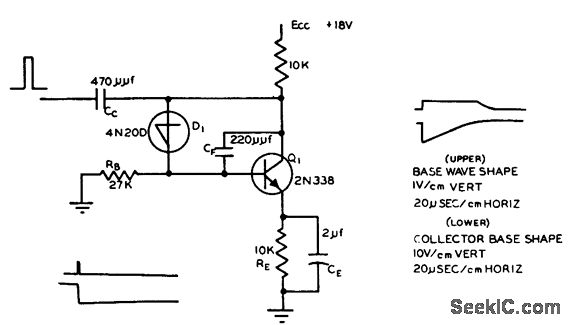 Uses Shockley four-layer diode and transistorized integrating circuit. Ramp starts with quick drop, then rises back to steady-state condition. Pulse width is 0.2 microsec at 400 pps.-Triggered Sawtooth Generator, Electronic Circuit Design Handbook, Mactier Pug. Corp., N.Y., 1965, p 169.
