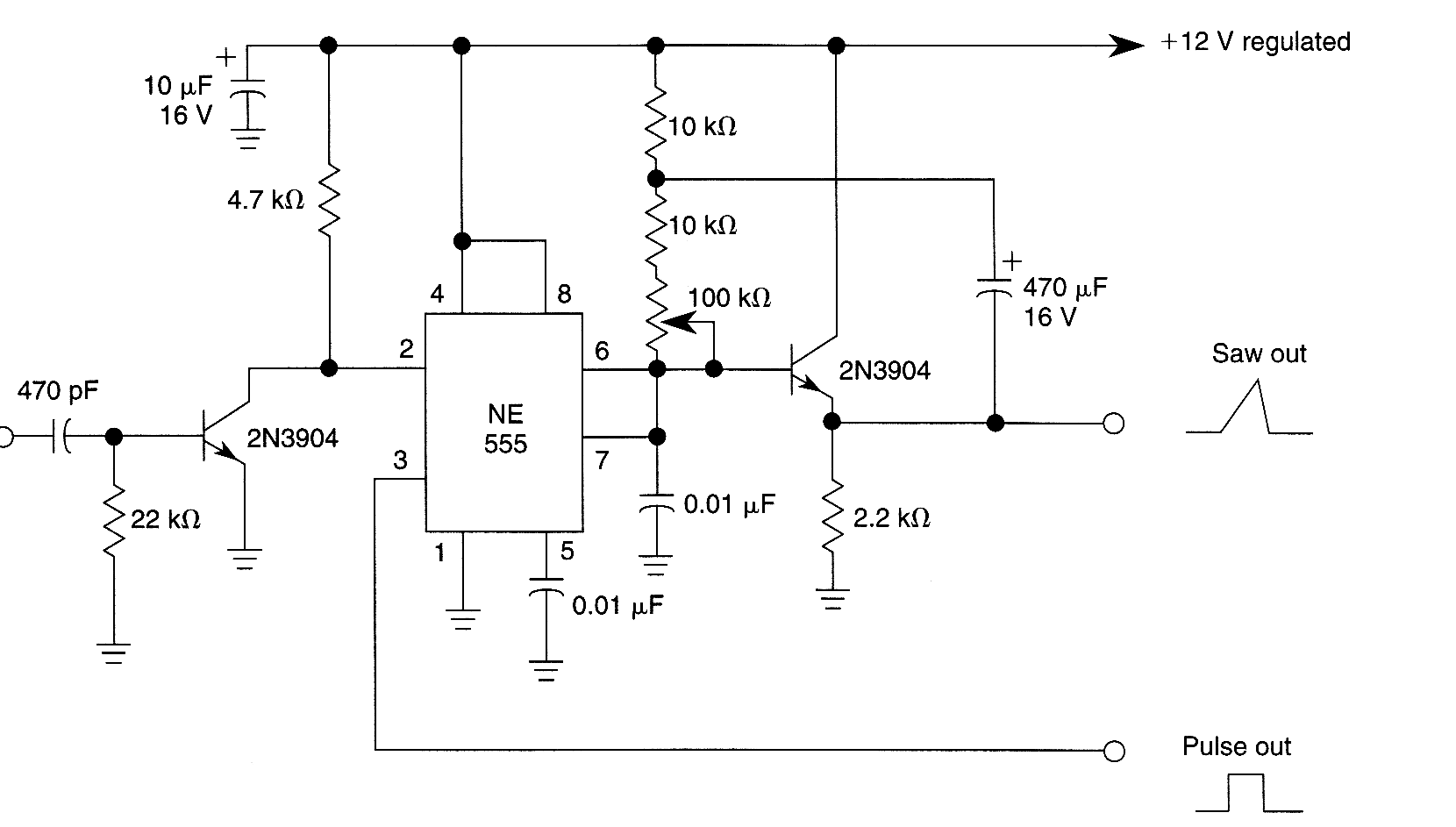 Two 2N3904 transistors and a 555 form a triggered sawtooth generator. A sawtooth or other rising voltage input provides a pulse output when the trigger point is reached.