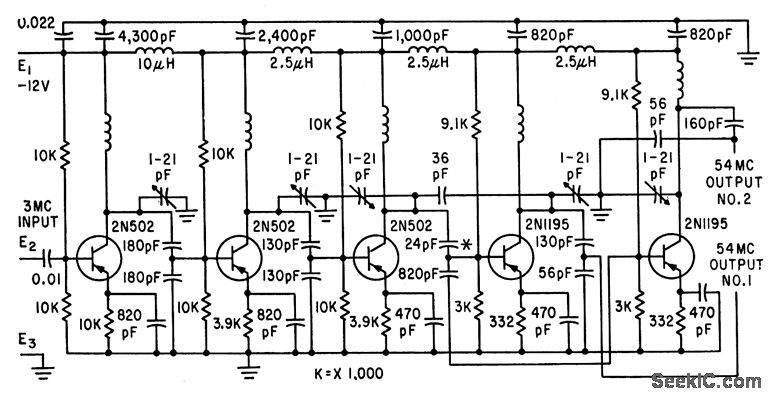 Uses three class AB common-emitter amplifiers.First two are triplets that multiply 3-Mc input to 27 Mc. Third doubles this to 54 Mc, and drives two parallel 54.Mc class AB output amplifiers providing 25 mw each.-J. W. Hamblen and J. B. Oakes, Instrumentation and Telemetry of Transit Navigational Satellites, Electronics, 34:32, p 148-153.