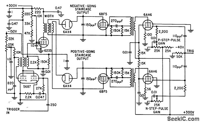 Negative-going staircase is developed from positive potential, and positive-going staircase from negative potential. Output voltage across 150-mmfd capacitors is 800V peak-to-peak, enough to drive crt directly.-M. T. Nadir, Microsecond Sampler Handles 126 Channels, Electronics, 32:4, p 36-39.