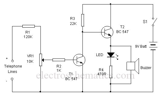 This simple circuit can indicate a misuse or tapping of Telephone line through a loud alarm. The circuit is too simple and can be easily assembled on a common PCB.Line voltage of Telephone lines is around 48 volts DC in the On hook state. When the handset is lifted, this voltage reduces to 12 volt DC. This change in voltage level is used to activate the circuit. When the switch S1 is closed, circuit becomes active and the telephone enters into the armed state. The high volt DC from the telephone line passes through R1 and VR1 and bias T1 into conduction. As a result, the collector of T1 goes to ground potential to inhibit T2 from conduction. Buzzer and LED thus remain off.When the handset is lifted, the DC voltage from the telephone lines drops to 12 volts. This turns off T1 and T2 conducts. Buzzer beeps and LED lights indicating that the telephone is using.