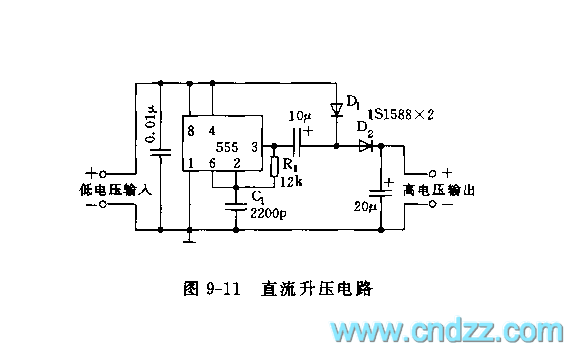 As shown on the figure 9-11, the astable multi-oscillation consists of the 555,R1 and C1. The oscillation frequency depends on the time constant of R1 and C1. The frequency shown on the figure is about 20kHz. The output voltage is about 2.2 times higher than the input DC voltage by dual voltage rectified. The load current can reach 50mA. It uses the bipolar 555.