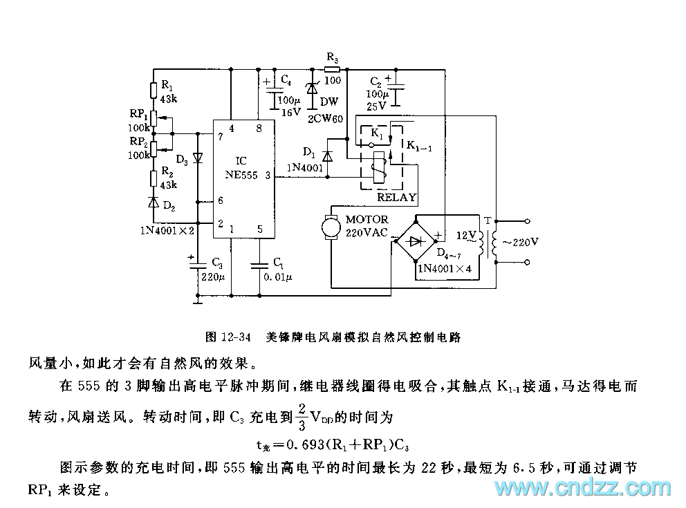 The circuit is shown in Figure 12-34, which consist of sub-circuits of AC step-down rectifier, low-frequency non-steady multi-resonate oscillator and relay controller motor, etc. This circuit is simple. And the simulated wind is vivid, it is strong sometimes or weak other times, so the effect is good.The time-based 555 circuit, R1,R2,RP1,RP2,C3 and so on consist a non-steady multi-resonate oscillator, the oscillating frequency is very low, which is