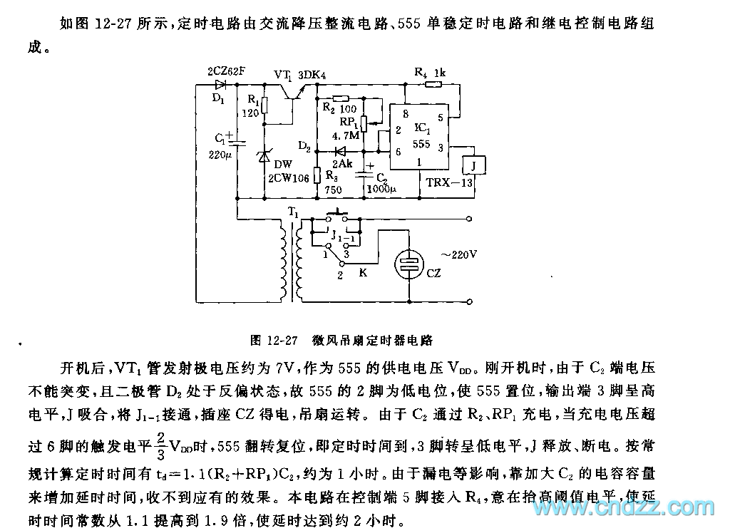 Figure 12-27 the breeze ceiling fan timer circuitAfter the fan has started, the voltage on injection pole of VT1 pipe is about 7v, which is the power supply voltage of 555. And when it is starting, since the voltage on C2 can not be changed suddenly, and the diode of D2 is in a reverse bias state, so the 2-pin of 555 is in a low LEV which makes 555 offset, the 3-pin is in a high LEV, J pulls in and J1-1 is getting through, the outlet of CZ gets power and the fan runs.